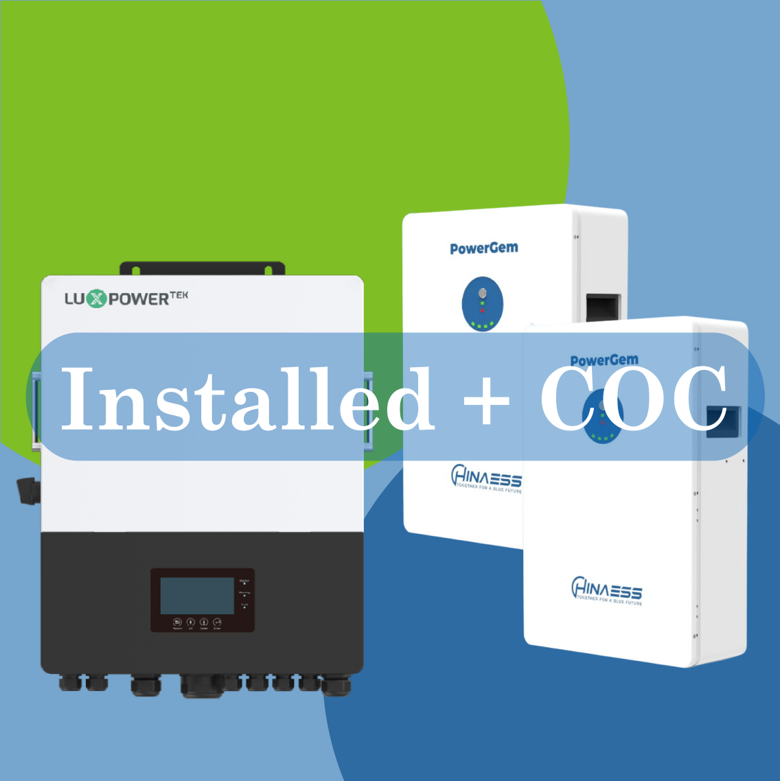 Combo K9 includes a LuxPower LXP 12kW Single phase hybrid inverter and 2 HinaESS PowerGem 5.12kW batteries. + installation and coc